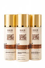 STEP 2 - Active Blend pH 4,0 Reestruturador interno e externo da fibra capilar. Desenvolvido com um blend de óleos nobres, queratina hidrolisada e polímeros catiônicos, é um composto singular, em gel, que facilita a penetração nas fissuras do fios, formando uma película protetora. Age de forma inteligente nas cutículas do fio finalizando o processo do PPC50. O Active Blend tem efeito bio-ativo que promove massa onde ainda há fissuras, permitindo que o fio de cabelo fique totalmente recuperado, selado e que a fibra capilar retorne ao seu comportamento natural.